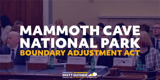 “I’m grateful to the House Committee on Natural Resources for taking an important step to advance my Mammoth Cave National Park Boundary Adjustment Act by conducting today’s legislative hearing,” said Congressman Guthrie. “My bill will not only improve the visitor experience at the Park, but it will also expand countless economic opportunities for the local communities surrounding Mammoth Cave.” A written statement for the record, submitted by Congressman Guthrie, can be found here. A written statement for the record, submitted by Judge Lindsey, can be found here. Photos from today's hearing can be found here. Background: The Mammoth Cave National Park Boundary Adjustment Act was introduced by Congressman Guthrie and Senator Mitch McConnell on May 8, 2025. This bill would give the park the ability to acquire an additional 551.14 acres of land from The Nature Conservancy. This newly acquired land would enhance protections in the Green River watershed, further conserving the area’s wildlife and cultural heritage while generating additional tourism to Kentucky’s Second District. Edmonson County Judge Executive Scott Lindsey’s Opening Statement as prepared for delivery: “Chairman Tiffany, Ranking Member Neguse, and members of the Subcommittee, thank you for allowing me to testify today on behalf of Congressman Brett Guthrie and his bill, H.R. 3286, the Mammoth Cave National Park Boundary Adjustment Act of 2025. I appreciate the opportunity to speak about the importance of Mammoth Cave National Park not only to my county, Edmonson County, but to surrounding counties and the entire Commonwealth of Kentucky. “Officially established as a National Park in 1941, Mammoth Cave National Park is home to the world’s longest known cave system, with more than 400 miles of surveyed underground passageways and miles still unexplored. The park’s roughly 52,000 acres extend across Edmonson, Barren, and Hart counties and provide a wide range of recreational opportunities including cave tours, hiking, camping, horseback riding, canoeing, kayaking, and fishing. “What makes Mammoth Cave truly unique is that it operates on two levels: a rich forested landscape and river system above ground, and an extraordinary cave network below. Together, these features create one of the most remarkable natural environments in the United States. “For generations, Mammoth Cave has served as a place of discovery for visitors, scientists, and students. The cave system preserves an incredible record of geological history while also protecting important cultural resources. Evidence of early exploration, prehistoric activity, and historic mining remains throughout the cave system. These resources make Mammoth Cave not only a natural wonder, but also a valuable site for scientific research, education, and historical preservation. “The park is also a major economic engine for our region. Visitors from across the country and around the world travel to Kentucky not only for horse racing, bourbon, and Abraham Lincoln’s birthplace, but also to explore Mammoth Cave National Park. In 2024 alone, approximately 747,000 visitors came to the park and spent an estimated $73.2 million in nearby communities. Those expenditures supported more than 880 jobs and generated nearly $100 million in economic output for the local economy. “For rural communities like mine, those numbers matter. Tourism connected to Mammoth Cave supports local restaurants, hotels, outfitters, and small businesses throughout the region. “The legislation before you today would help strengthen that impact while also protecting critical natural resources. H.R. 3286 would authorize the Secretary of the Interior to acquire approximately 551 acres of land currently owned by The Nature Conservancy and incorporate it into Mammoth Cave National Park. “This property lies within the Green River watershed, one of the most biologically diverse aquatic ecosystems in the United States. The area contains numerous cave passages, including Coach Cave and James Cave, which provide important habitat for endangered bat species. Protecting these habitats is essential for the recovery of these species and for the long-term ecological health of the region. “Equally important, these caves contain significant cultural and archaeological resources. Evidence suggests these caves played a role in early American history through saltpeter mining during the War of 1812 and contains signatures left by Civil War soldiers who explored the cave in 1862. “No organization is better equipped to protect these natural and cultural resources than the National Park Service and the experts at Mammoth Cave National Park. “I also want to emphasize an important point: this acquisition involves land already owned by The Nature Conservancy. No additional private property is involved. The property is already under a conservation easement that restricts development, and because of its nonprofit ownership status, the county is not currently collecting property taxes on it. Therefore, the transfer of this land into the park will not reduce our local tax base. “The purchase price for the property is just under $1 million and will be funded through the Land and Water Conservation Fund along with National Park Service allocations. Importantly, it is my understanding that all sale proceeds received by The Nature Conservancy will be reimbursed back to the Imperiled Bat Conservation Fund to support future conservation efforts. “This legislation has strong support from local leaders, regional organizations, and conservation partners across Kentucky. “As County Judge Executive, one of my priorities is supporting local businesses and encouraging economic growth in our rural communities. Expanding and protecting Mammoth Cave National Park helps accomplish both goals. This investment will safeguard critical habitat, preserve irreplaceable historical resources, and expand recreational oppo